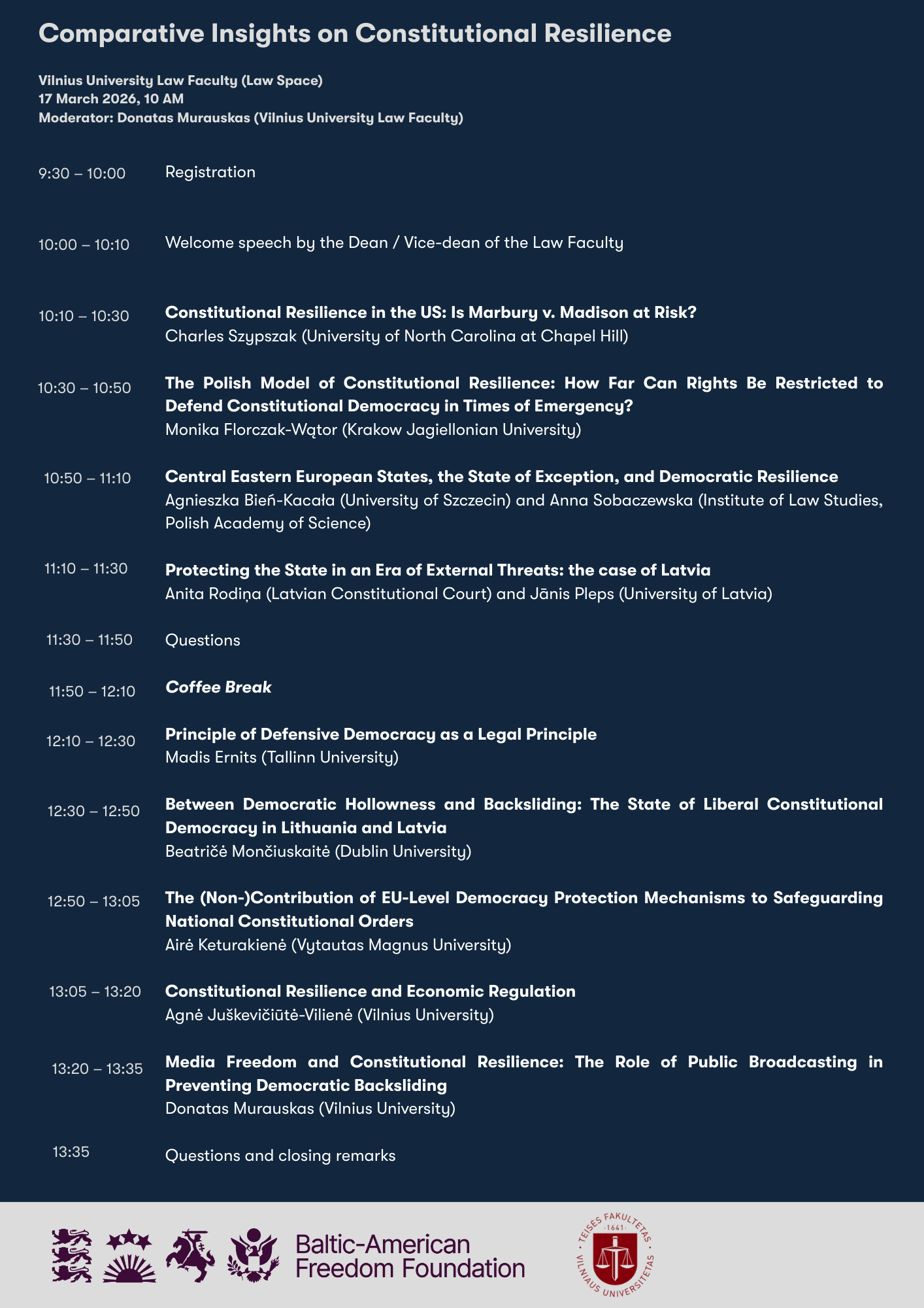 Diskusijoje konstitucinis atsparumas bus nagrinėjamas regioniniu požiūriu, remiantis Baltijos valstybių ir Lenkijos patirtimis. Renginio metu svečias prof. Charles Szypszak iš Šiaurės Karolinos universiteto pateiks lyginamąsias įžvalgas apie JAV konstitucinį atsparumą, pabrėždamas šių dienų realijas ir JAV Aukščiausiojo Teismo, kaip konstitucinės santvarkos garanto, vaidmenį.