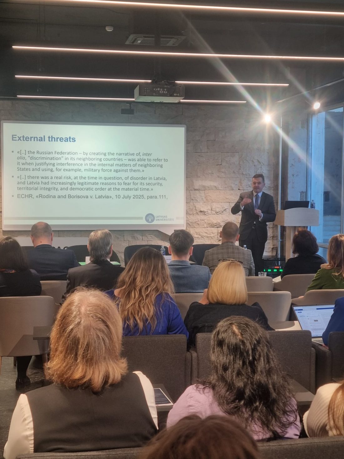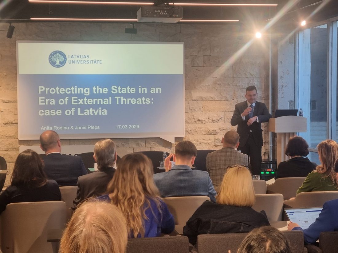 Latvijos universiteto profesorius Jānis Pleps pristatė kartu su Anita Rodiņa (Latvijos Konstitucinis Teismas) atliekamą tyrimą apie Latvijoje taikomus į išorės grėsmes nukreiptus valstybės taikomas teisines priemones, akcentuodamas Latvijos nacionalinio saugumo įstatymą, kurio pakeitimai atspindi geopolitines įtampas.