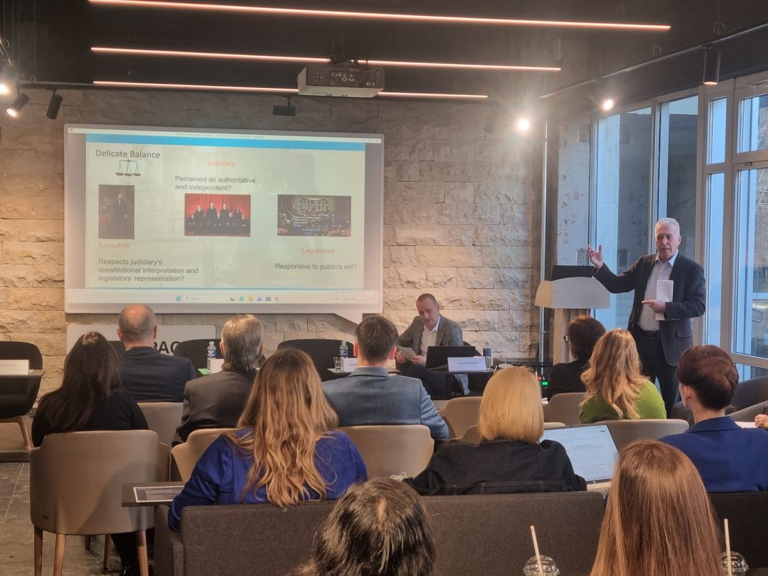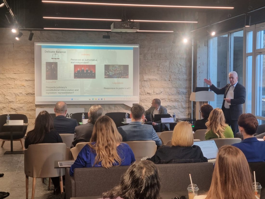 Konferenciją pradėjęs profesorius Charles Szypszak iš Šiaurės Karolinos universiteto pasakojo, kaip 1803 m. JAV Aukščiausiojo Teismo priimtas sprendimas Marbury v. Madison dar ir šiandien atlieka konstitucinio atsparumo funkcijas, Prezidentui savo vykdomaisiais sprendimais pastaruoju metu vis išbandant peržengti teisės viešpatavimo principus.