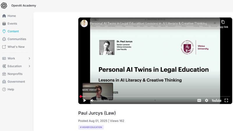 Having gained international attention and recognition in Lithuania, the artificial intelligence (AI) knowledge twins created by lecturers at Vilnius University (VU) Law Faculty have become a global example in OpenAI’s The Global Faculty AI Project, where Senior Lecturer Dr LL.M. Paulius Jurčys shares his best teaching practices involving AI tools in a video posted on the website.
