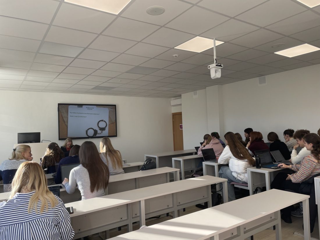 Spalio 23 dieną moksleiviai klausėsi prof. dr. Jono Prapiesčio paskaitos Baudžiamoji teisė. Bendroji dalis I–II dalys, taip pat vyko assist. dr. Lauros Šivickaitės-Molderienės organizuota Baudžiamojo proceso inscenizacija, leidusi iš arti pamatyti, kaip atrodo teismo procesas praktikoje. Tą pačią dieną įvyko ir nuotolinis susitikimas su Teisės fakulteto doktorantais Gintare Skripkute bei Pauliumi Skrupskiu, kurie pristatė teisės studijų struktūrą, specializacijas ir karjeros galimybes. Doktorantai dalijosi įžvalgomis apie studijų intensyvumą, praktikos vietų įvairovę bei darbo rinkos poreikius, pabrėždami, kad teisės studijos reikalauja motyvacijos, kruopštumo ir nuoširdaus susidomėjimo.